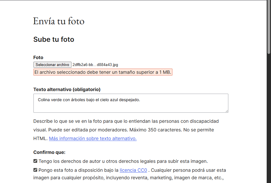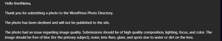 Durante el proceso de contribución, algunas de mis fotografías no fueron aprobadas por los moderadores debido a aspectos relacionados con la calidad de la imagen, como iluminación, enfoque o composición.